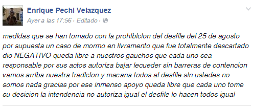El hecho causó molestia entre los integrantes de distintas aparcerías de la ciudad que desfilan cada año. Entre estos, el edil del Partido Nacional, Enrique Pechi, quien promovió el desacato a través de su cuenta de facebook, este pasado lunes. Pecchi cuestionó el accionar de la comuna y dijo que los gauchos eran libres de decidir e invitó a que desfilarán en la mañana de este 25 de agosto.